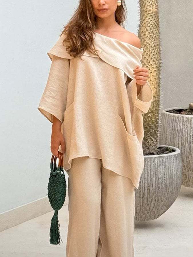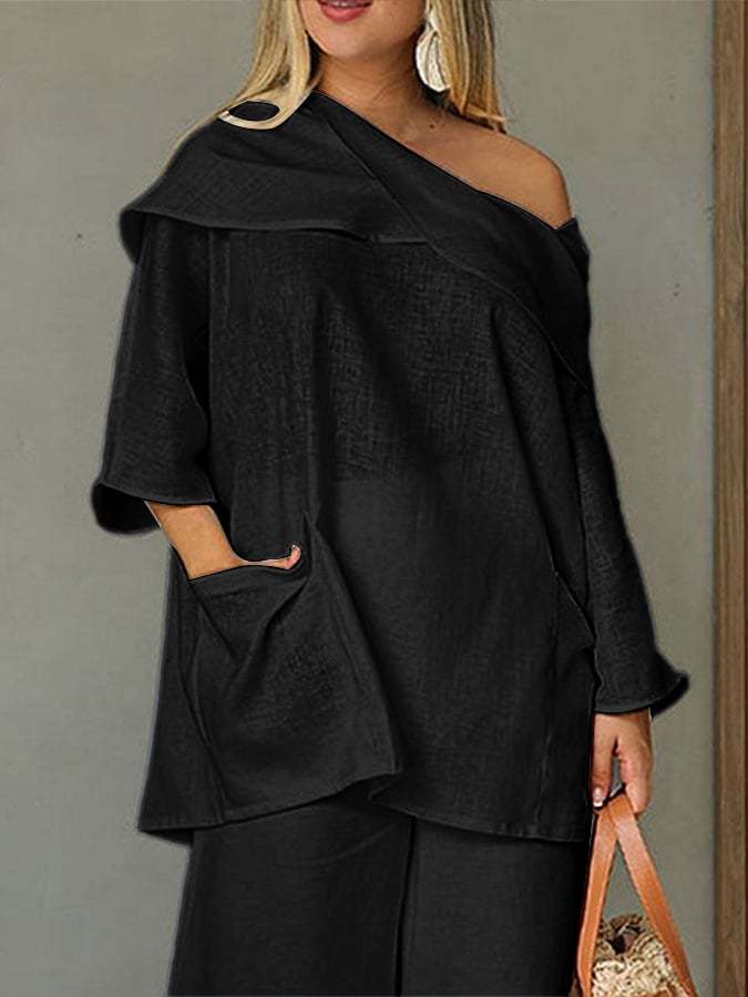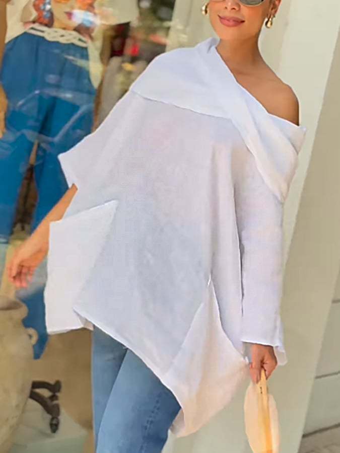 Damska, swobodna, jednokolorowa, bawełniano-lniana bluzka z długim rękawem