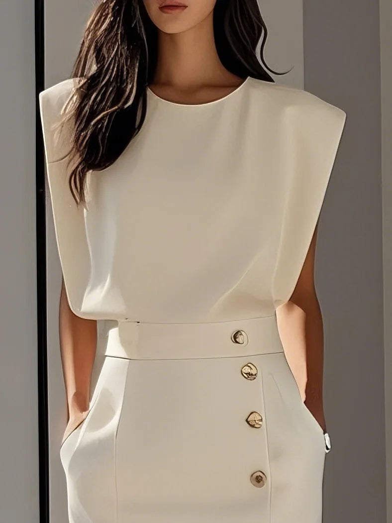 Jednokolorowa sukienka midi z rozcięciem na guziki i okrągłym dekoltem